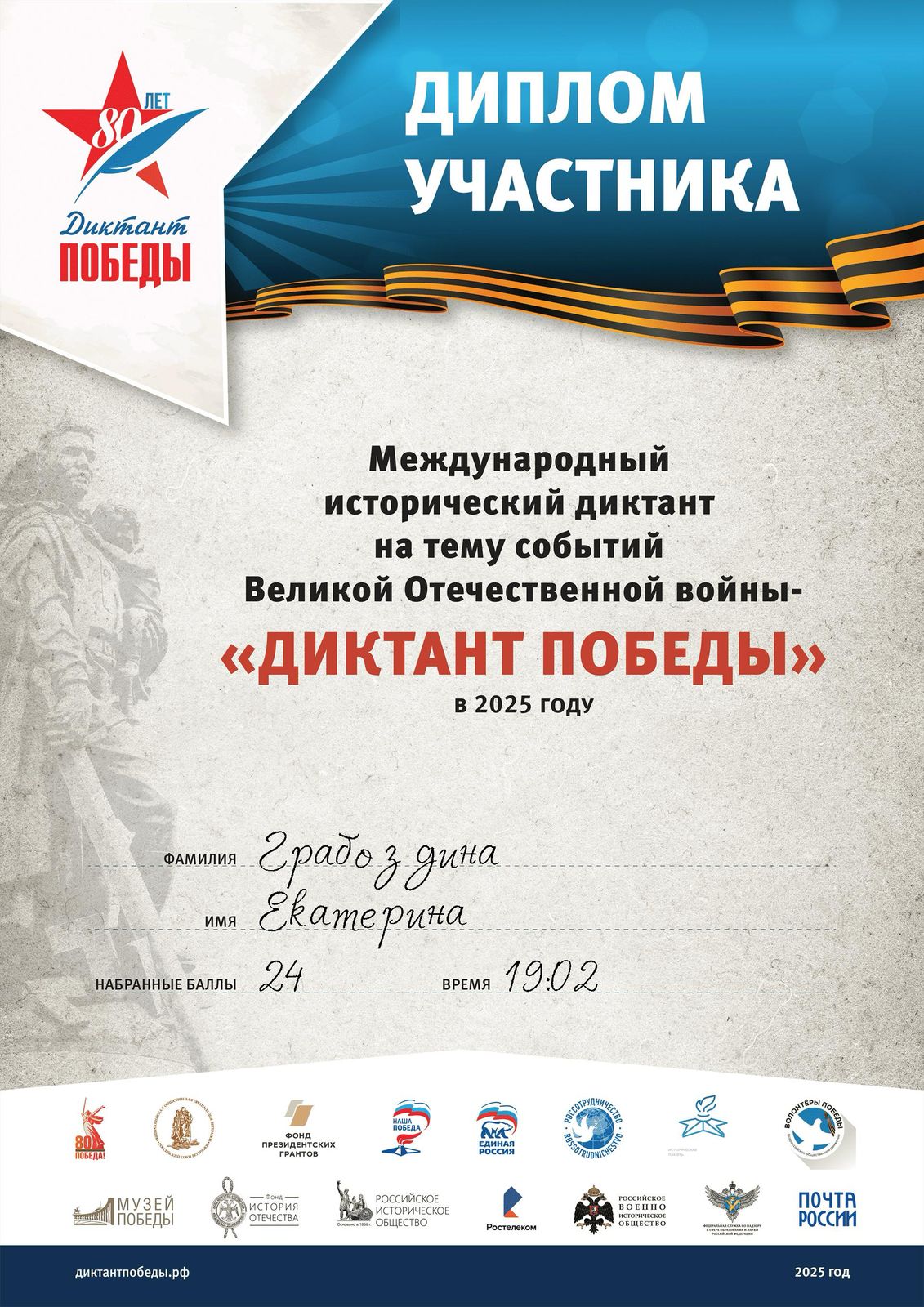 Диктант Победы как ежегодное тестирование о событиях Великой Отечественной войны – это один из инструментов, который помогает не забывать, сохранять и интересоваться историей своей страны. Важно сохранять историческую память, помнить и ценить то, что сделало Великое поколение Великой Победы! В этом году мы отмечаем восьмидесятилетие Великой Победы.