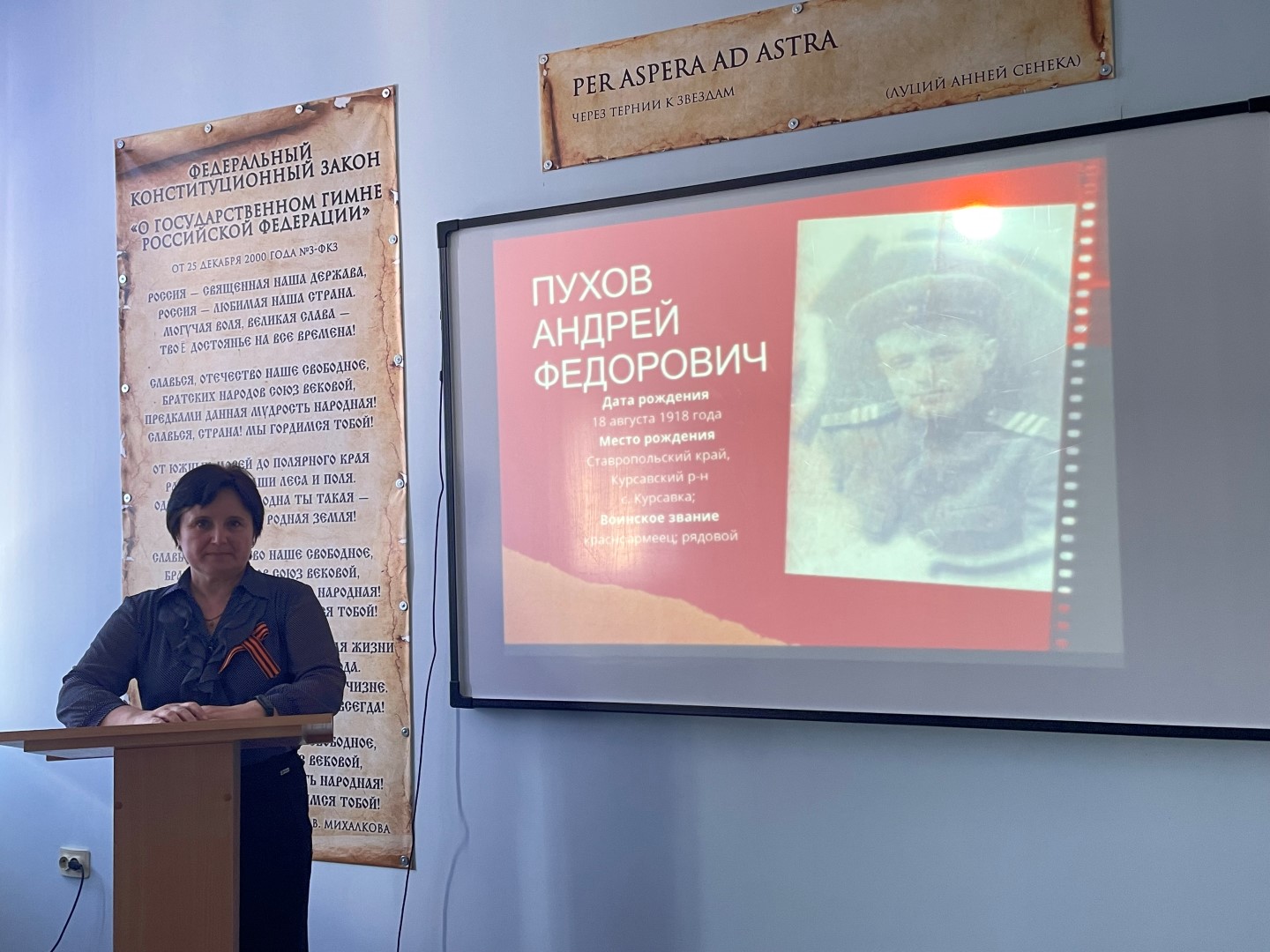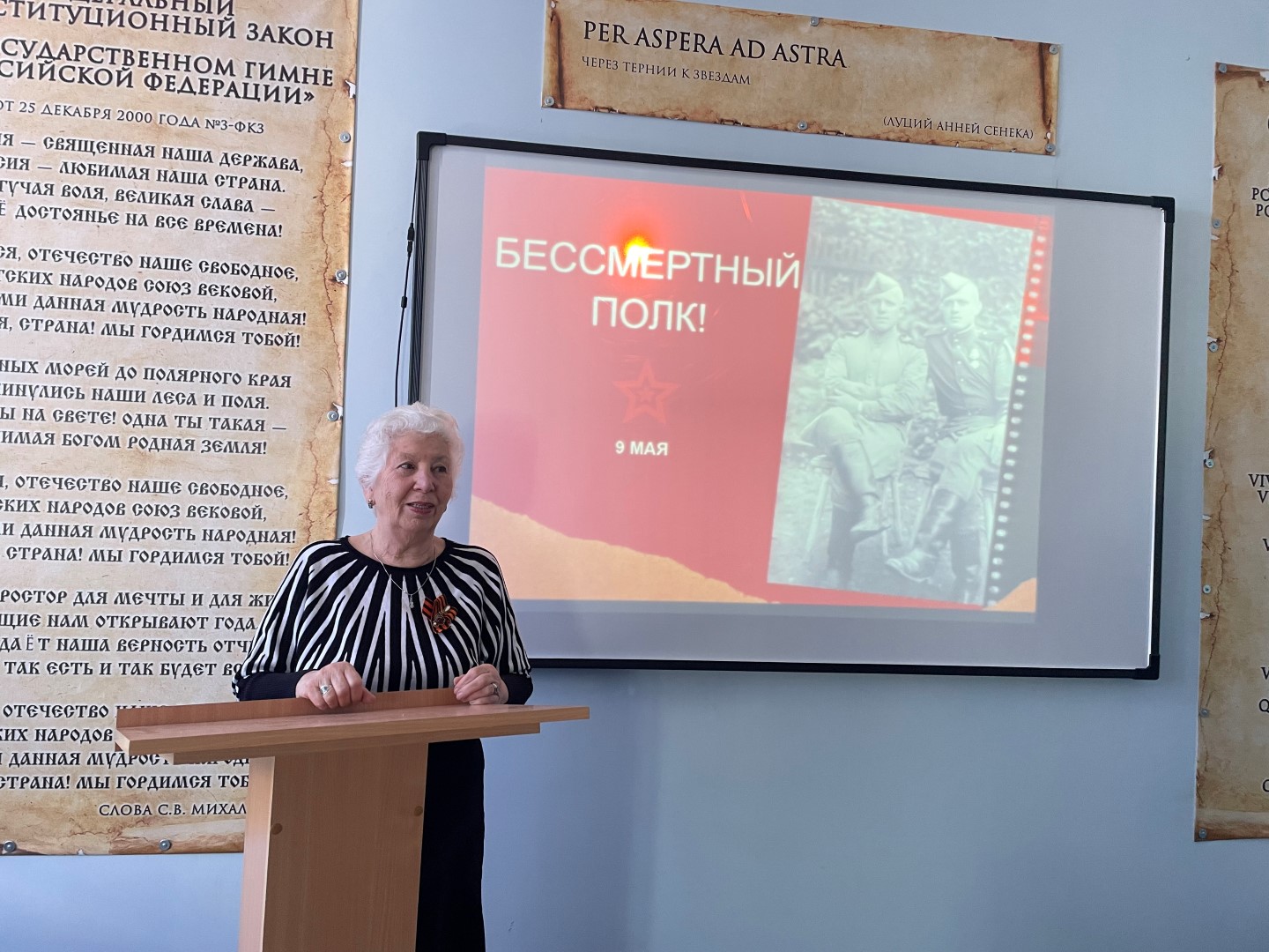 Канд. ист. наук, доцент Скрипник Л.А. рассказала обучающимся о своих родных и близких, принимавших участие в Великой Отечественной войне. В своем выступлении Лидия Александровна подчеркнула, что память о героизме и самоотверженности поколения победителей должна жить в сердцах потомков, отметила важность подобных мероприятий для сохранения исторической правды и воспитания патриотизма у молодежи.