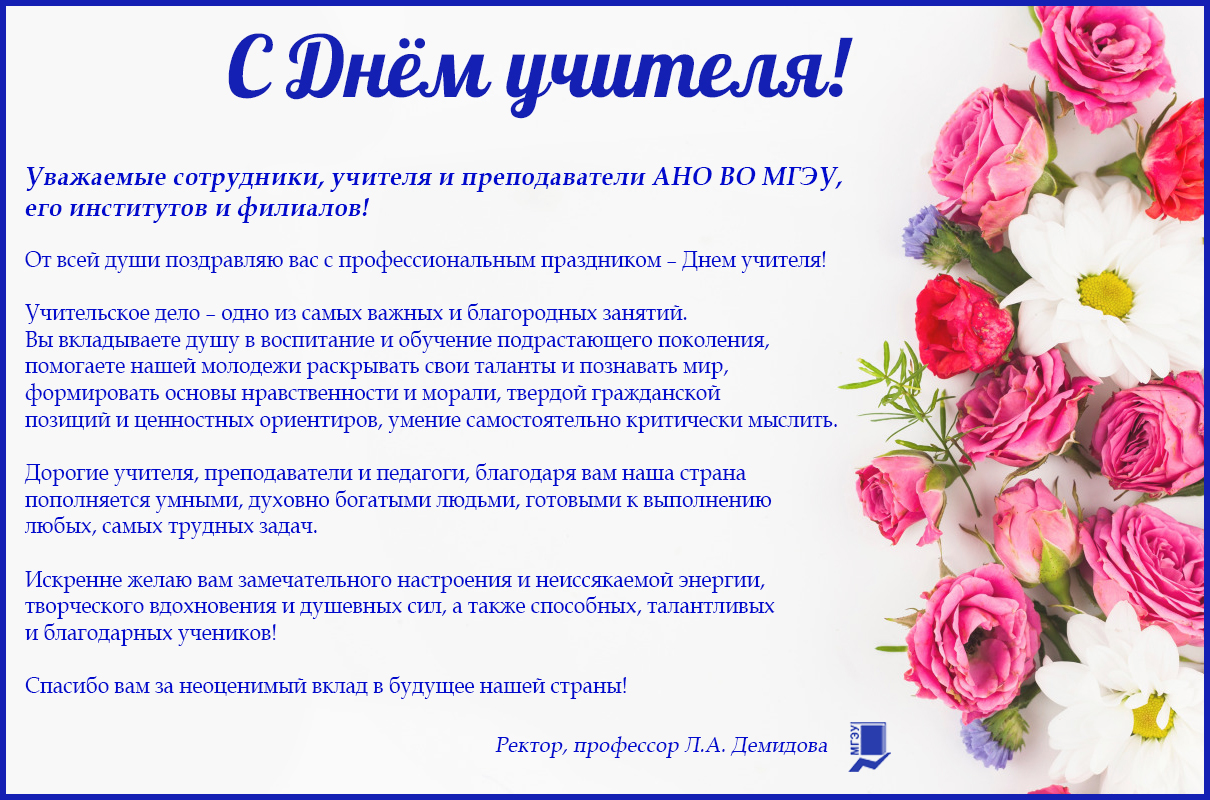 Поздравление ректора, профессора АНО ВО МГЭУ Демидовой Л.А. с Днем учителя