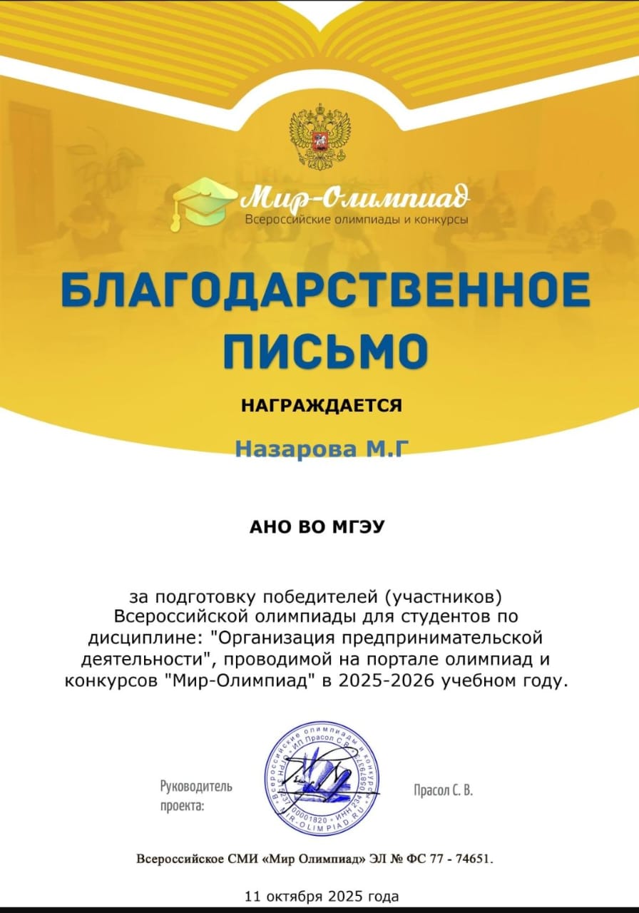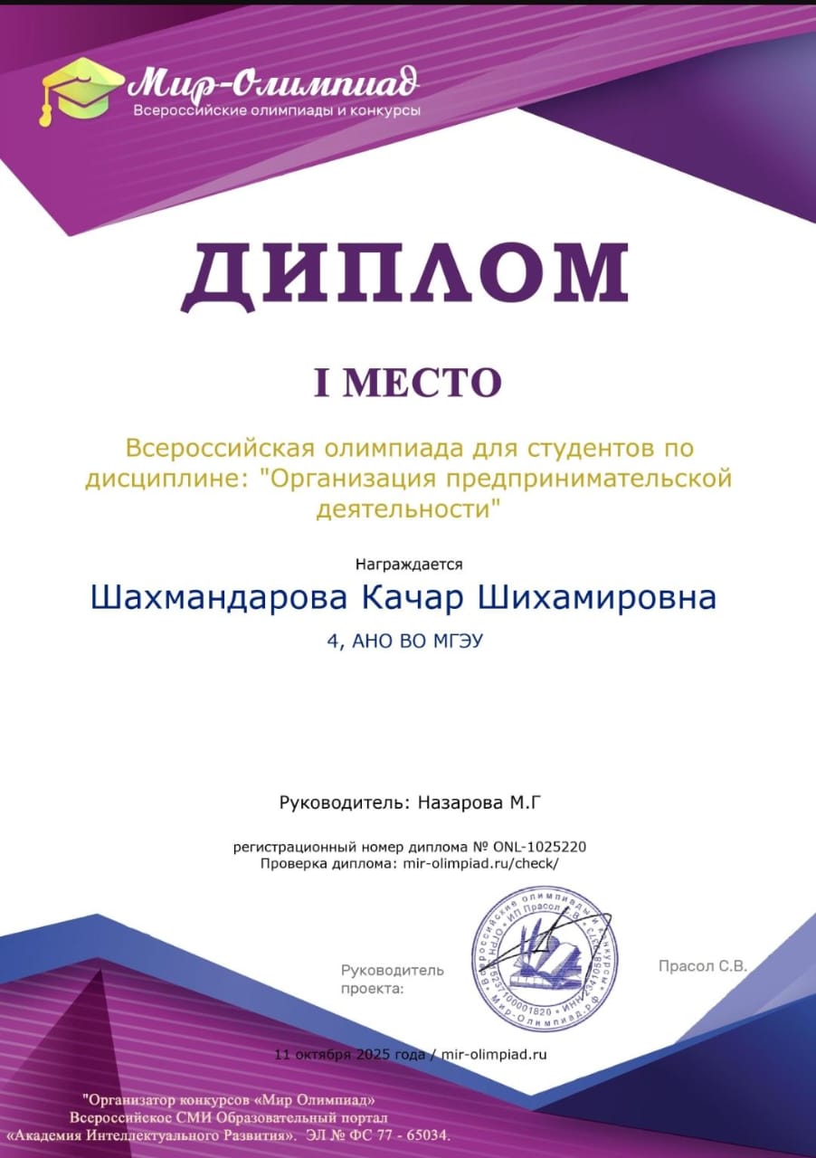 Так, Шахмандарова Качар, обучающаяся выпускного курса приняла участие во Всероссийской олимпиаде для студентов по дисциплине «Организация предпринимательской деятельности».