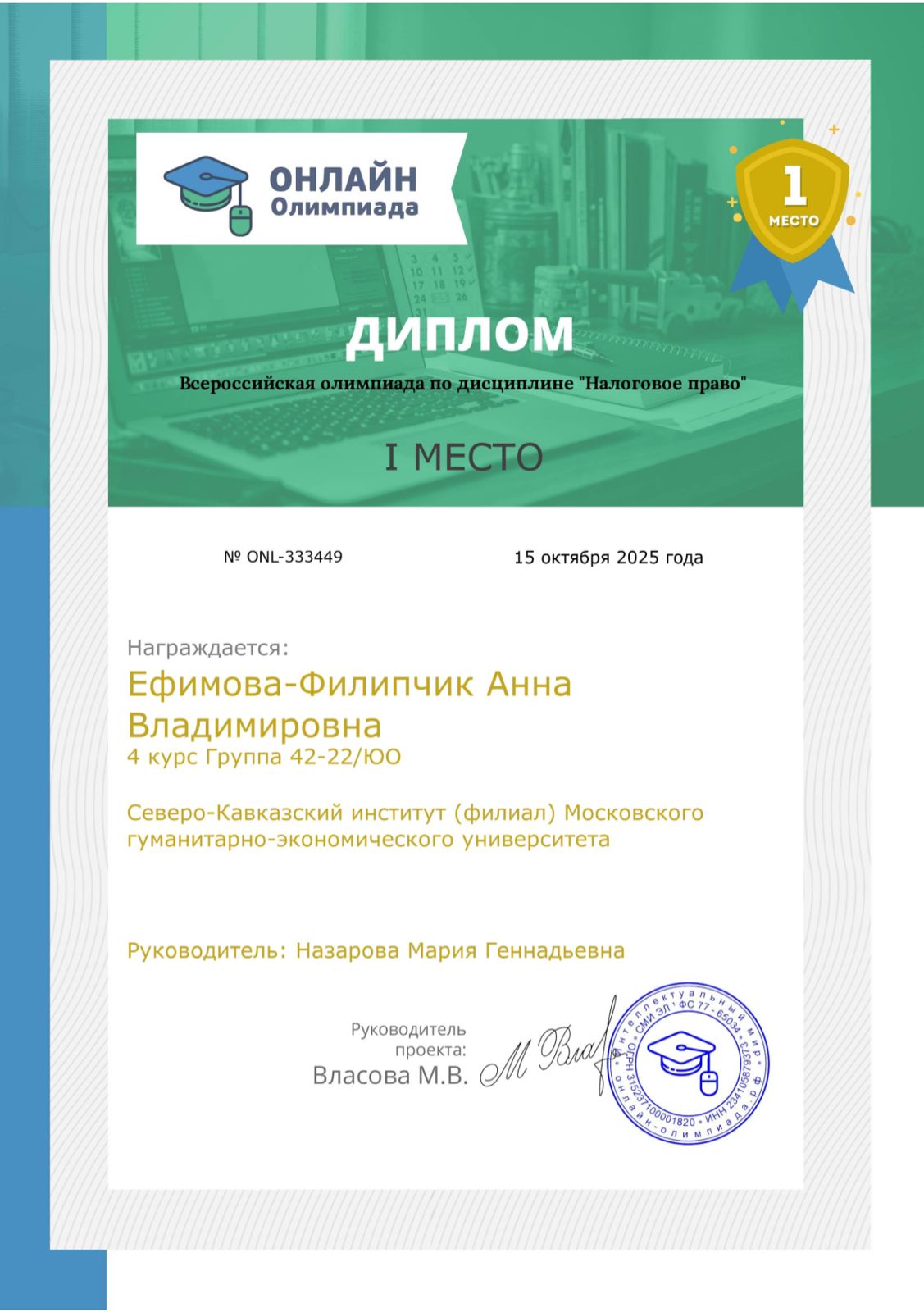 Емельянова Виктория и Ефимова-Филипчик Анна, обучающиеся выпускного курса, заняли 1 место во Всероссийской олимпиаде по дисциплине «Налоговое право».