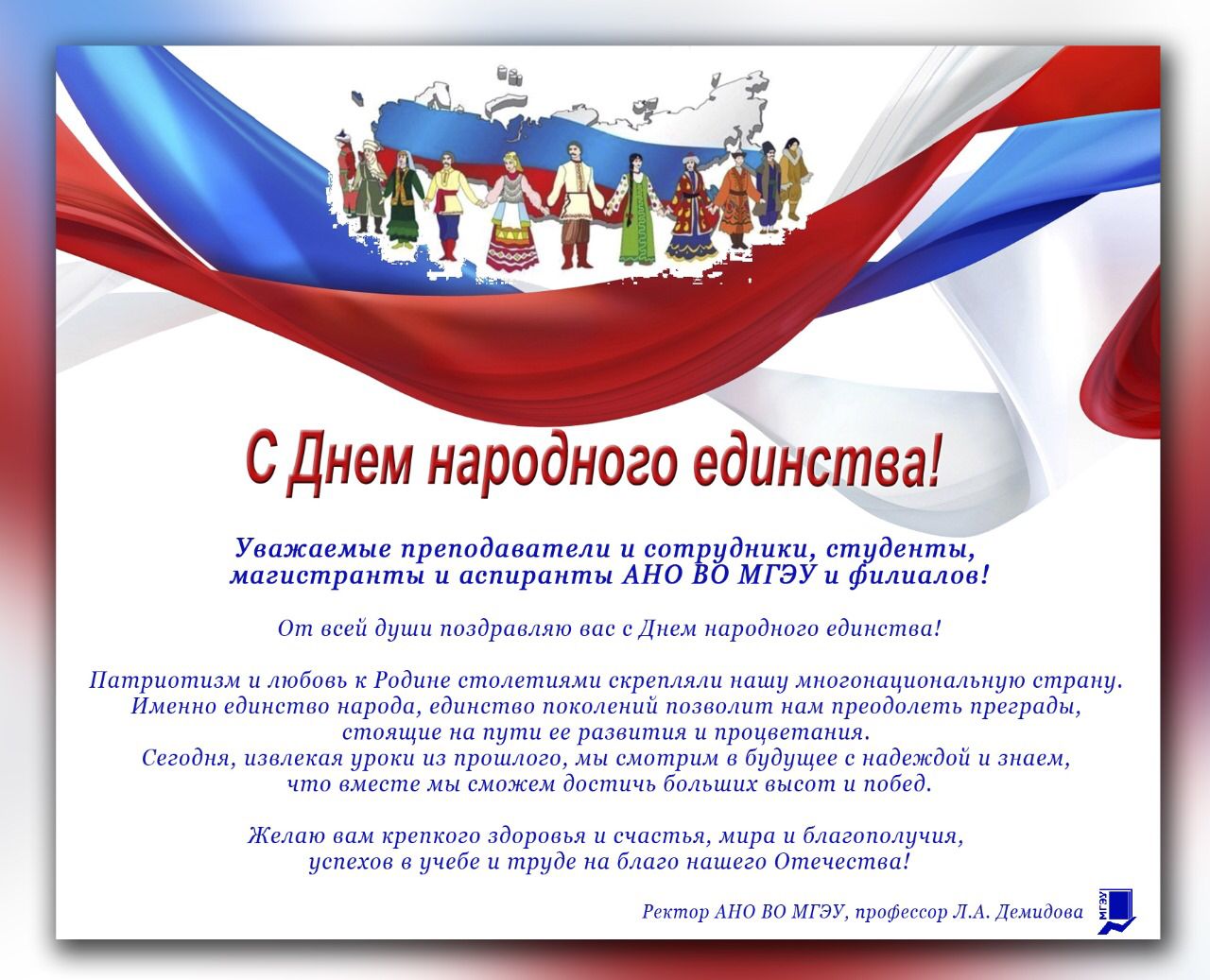 Поздравление ректора, профессора АНО ВО МГЭУ Л.А. Демидовой с Днем народного единства - 2025