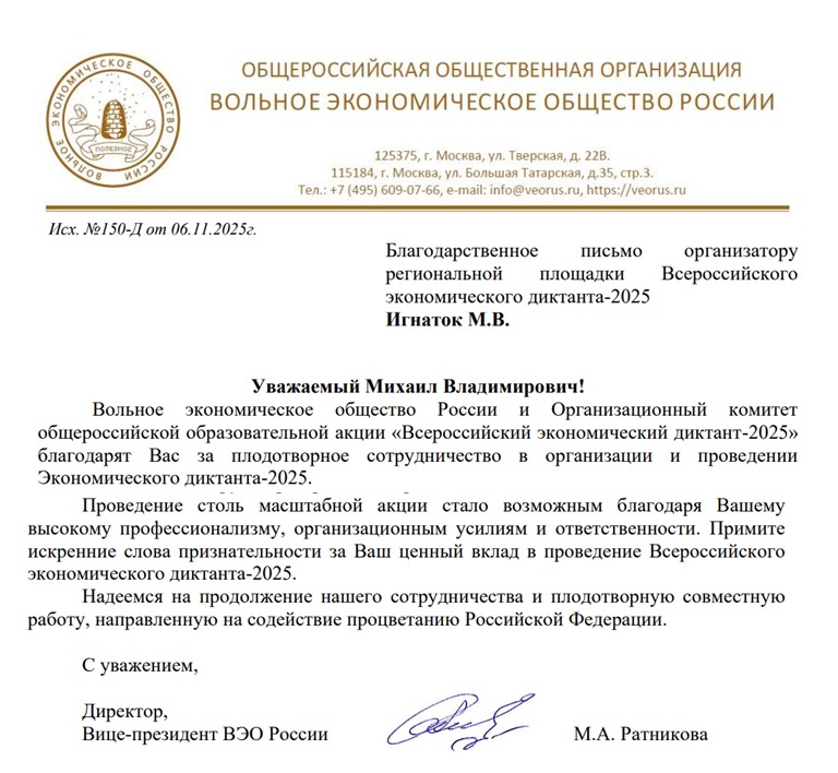 По итогам всероссийской акции в адрес организаторов направлены благодарственные письма Вольного экономического общества, в числе которых доцент кафедры таможенного дела Михаил Владимирович Игнаток. Руководство факультета экономики и управления присоединяется к словам благодарности в адрес нашего коллеги!