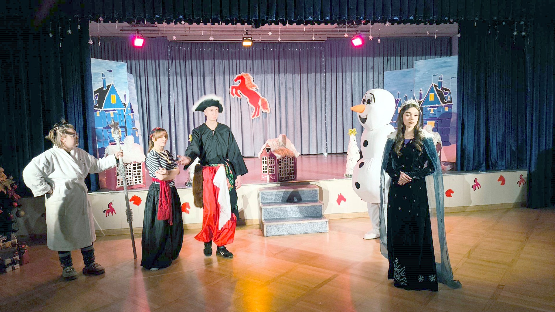 Атмосферу праздника создали любимые персонажи мультфильма «Холодное сердце»: веселый снеговик Олаф, отважная принцесса Анна и прекрасная Эльза, а также веселые Пираты и очаровательная Госпожа Лень. Дети активно участвовали в играх, пели песни, танцевали и весело проводили время в окружении любимых героев.