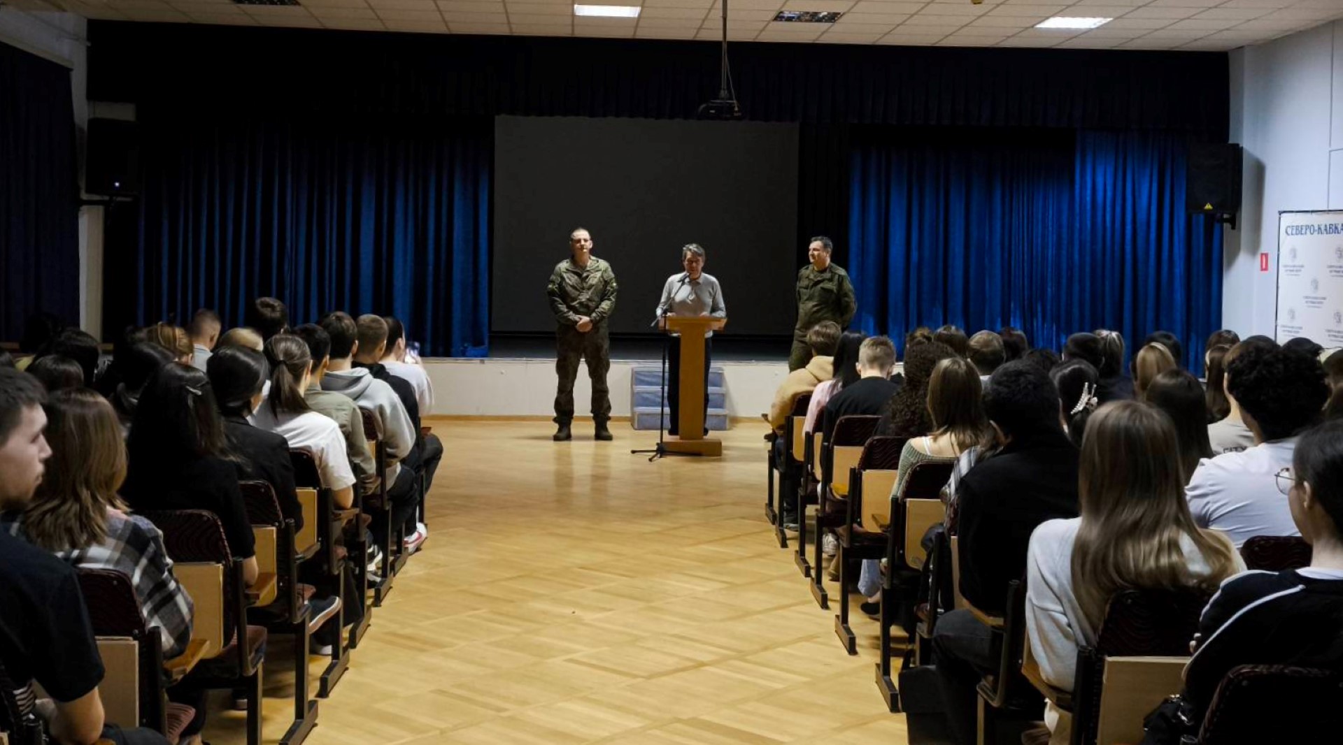 18 февраля 2026 г. в институте (филиале) состоялась встреча студентов с заместителем главы администрации Минераловодского муниципального округа Мельниковым О.А., военным комиссаром Минераловодского муниципального округа и городского округа города-курорта Железноводска Ставропольского края подполковником Жуковым А.А., инструктором пункта отбора на военную службу по контракту (1 разряда) г. Ставрополь сержантом Кочкаевым А.В.
