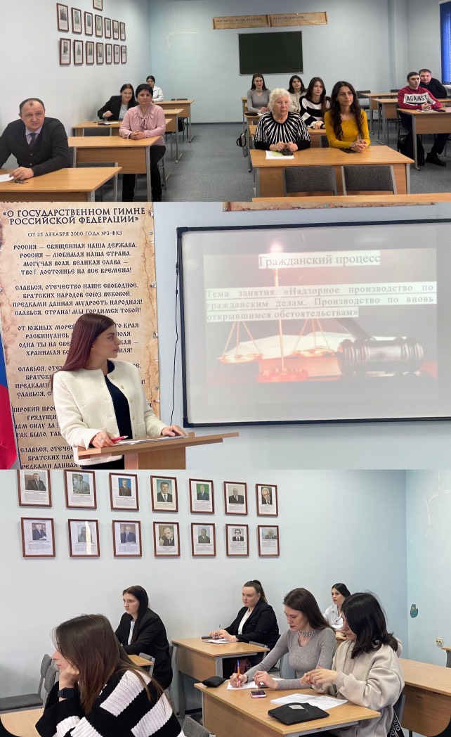20 марта 2025 года на юридическом факультете канд. юрид. наук, доцентом кафедры правовых дисциплин Шахназарян Т.Г. было проведено открытое лекционное занятие по дисциплине «Гражданский процесс» на тему: «Надзорное производство по гражданским делам. Производство по вновь открывшимся обстоятельствам».