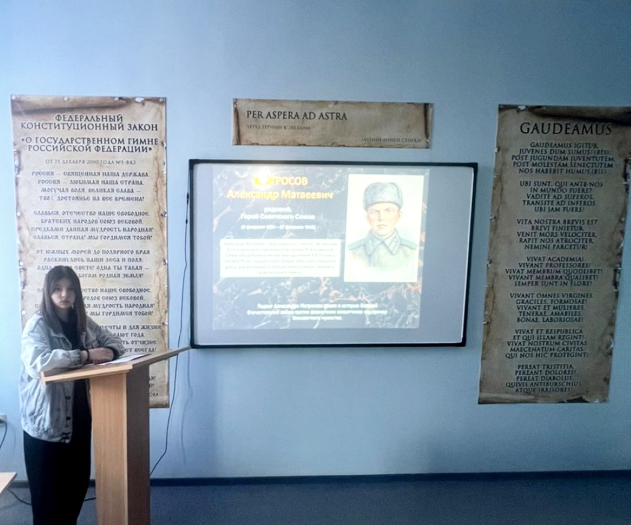 Во время Великой Отечественной войны (1941-1945) в конце февраля 1943 года был совершен подвиг, который в истории Великой Отечественной войны получил имя собственное: подвиг Александра Матросова. О подвиге гвардии рядового 19-летнего Александра Матвеевича Матросова, Героя Советского Союза подготовила выступление студентка первого курса Серан Диана.