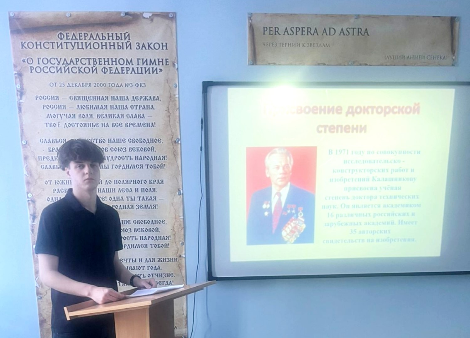 Иванов Кирилл рассказал присутствующим о Михаиле Тимофеевиче Калашникове - советском и российском конструкторе стрелкового оружия, создателе всемирно известного автомата Калашникова (АК).