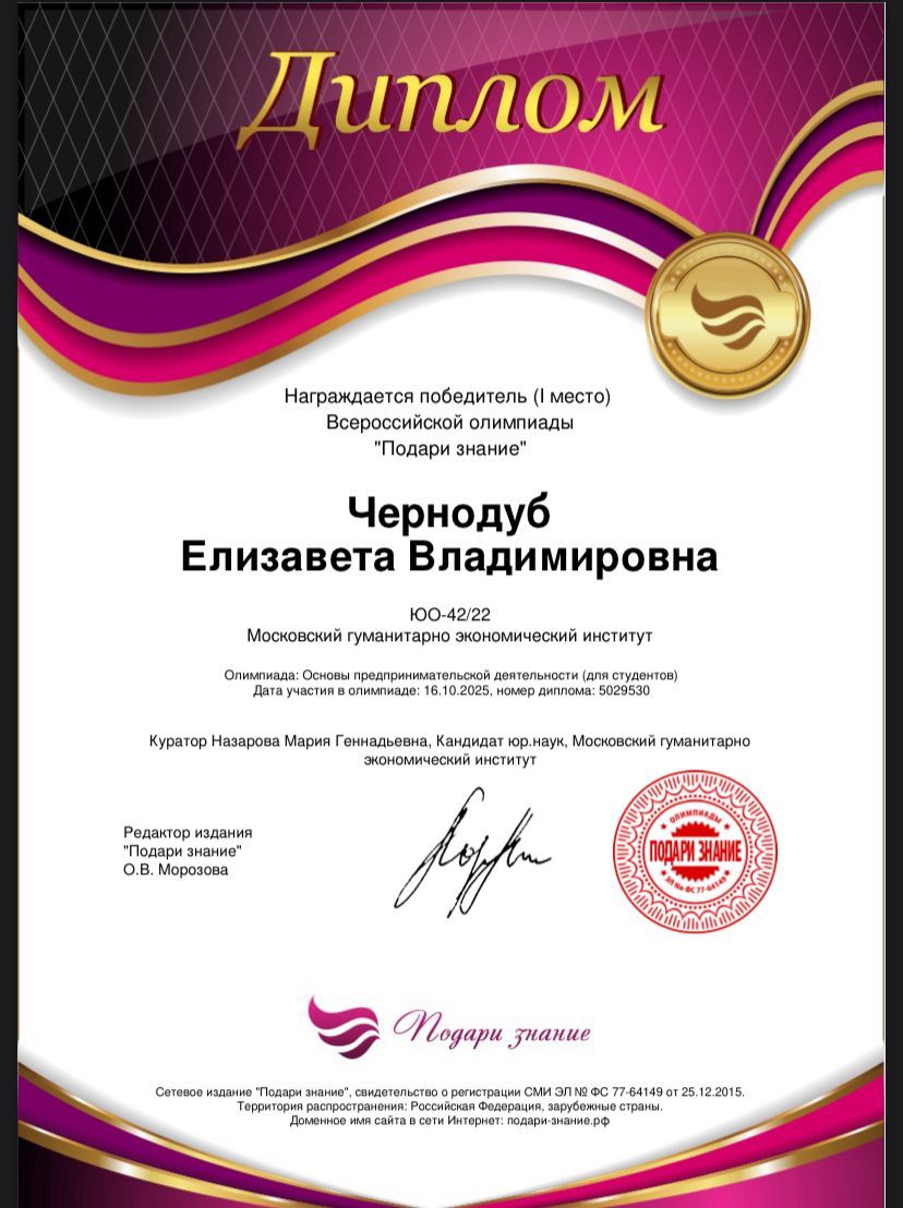 Чернодуб Елизавета, обучающаяся выпускного курса, стала победителем Всероссийской олимпиады «Подари знание» в номинации «Основы предпринимательской деятельности».