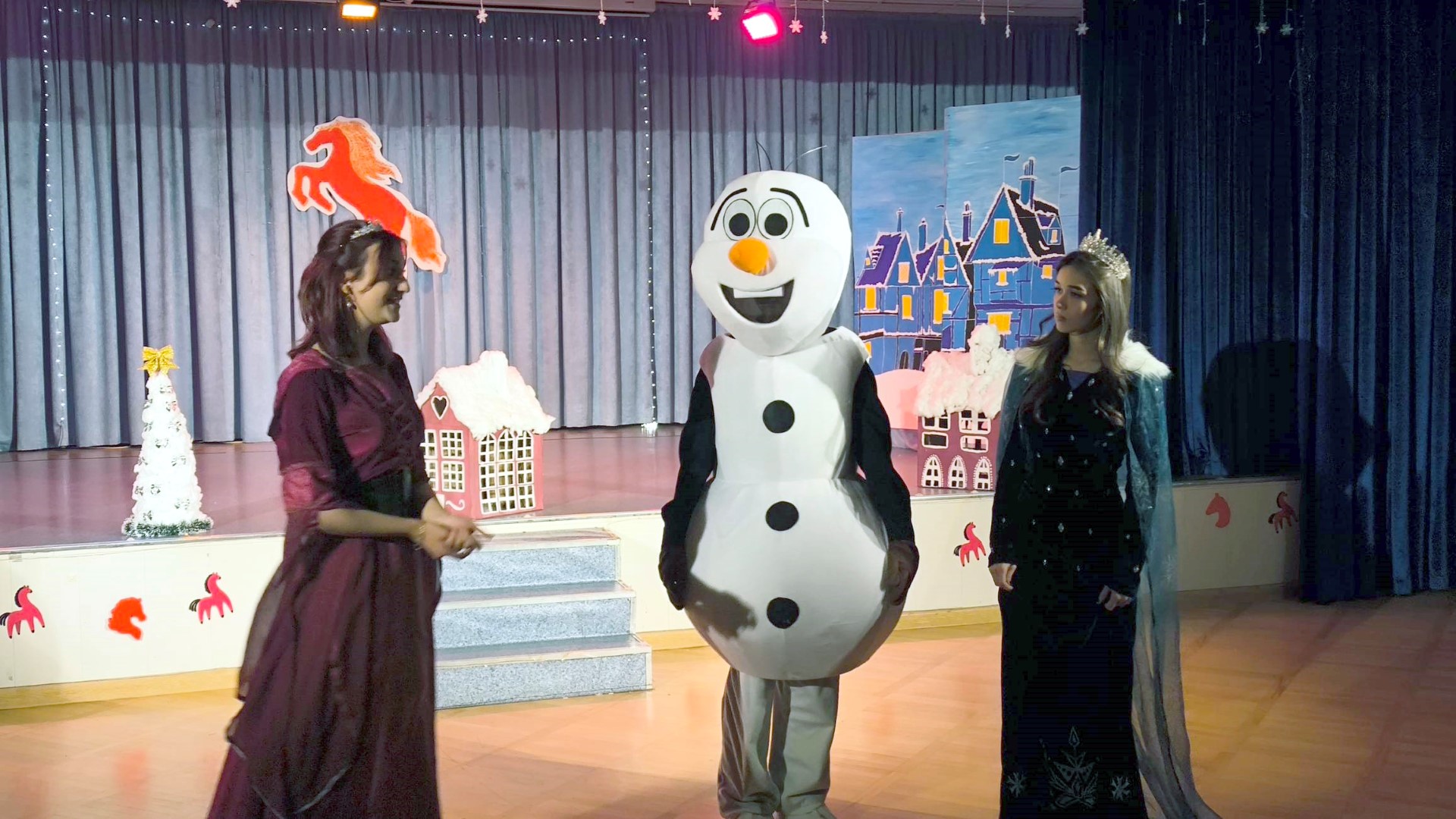 Атмосферу праздника создали любимые персонажи мультфильма «Холодное сердце»: веселый снеговик Олаф, отважная принцесса Анна и прекрасная Эльза, а также веселые Пираты и очаровательная Госпожа Лень. Дети активно участвовали в играх, пели песни, танцевали и весело проводили время в окружении любимых героев.