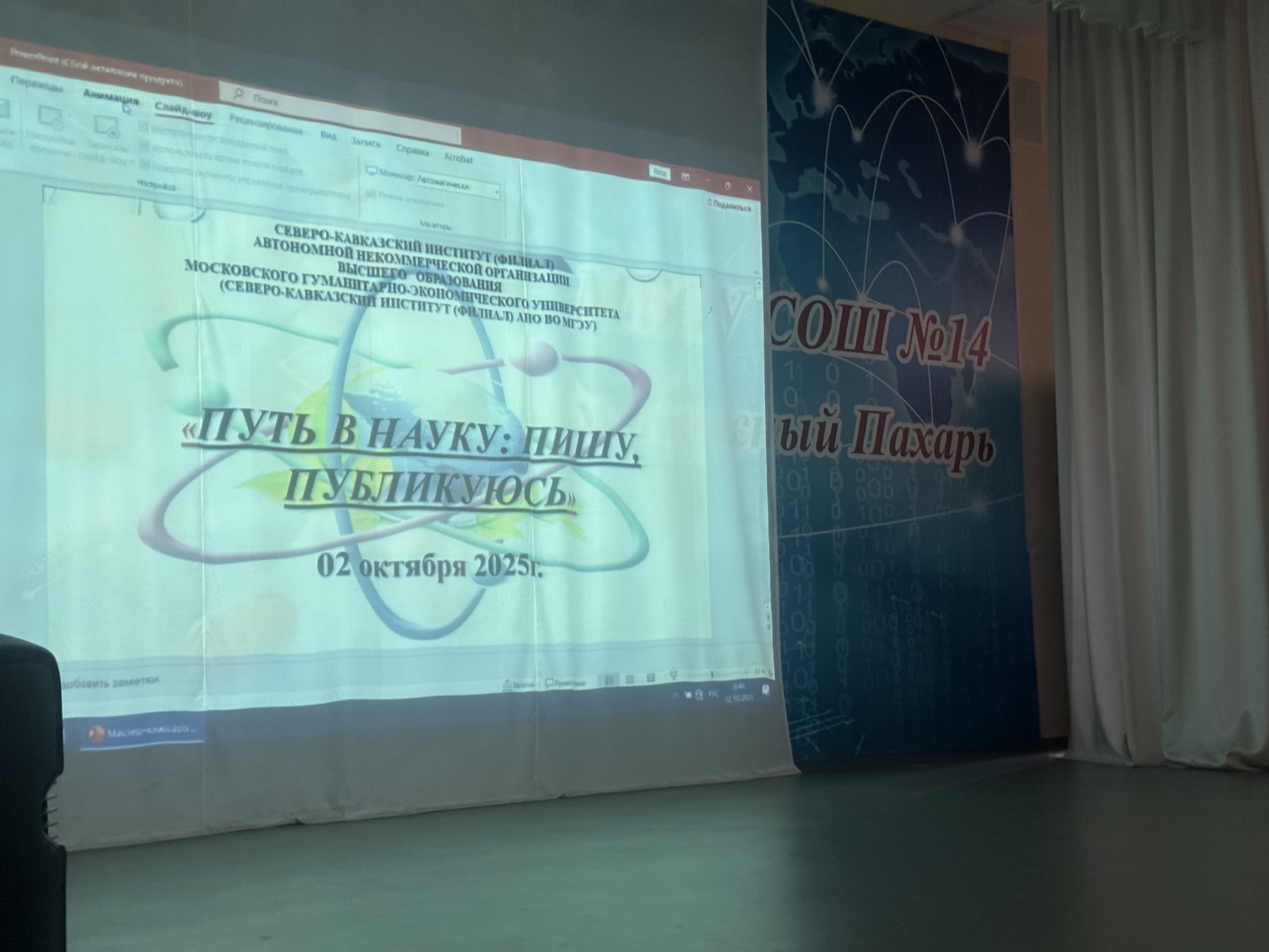2 октября 2025 года , в рамках реализации индивидуального проекта доцента кафедры правовых дисциплин, кандидата юридических наук Назаровой Марии Геннадьевны, на базе МБОУ СОШ № 14 х. Красный Пахарь МГО среди учащихся 10-х классов образовательного учреждения был организован и проведен мастер-класс по подготовке и написанию научных статей «Путь в науку: пишу, публикуюсь».
